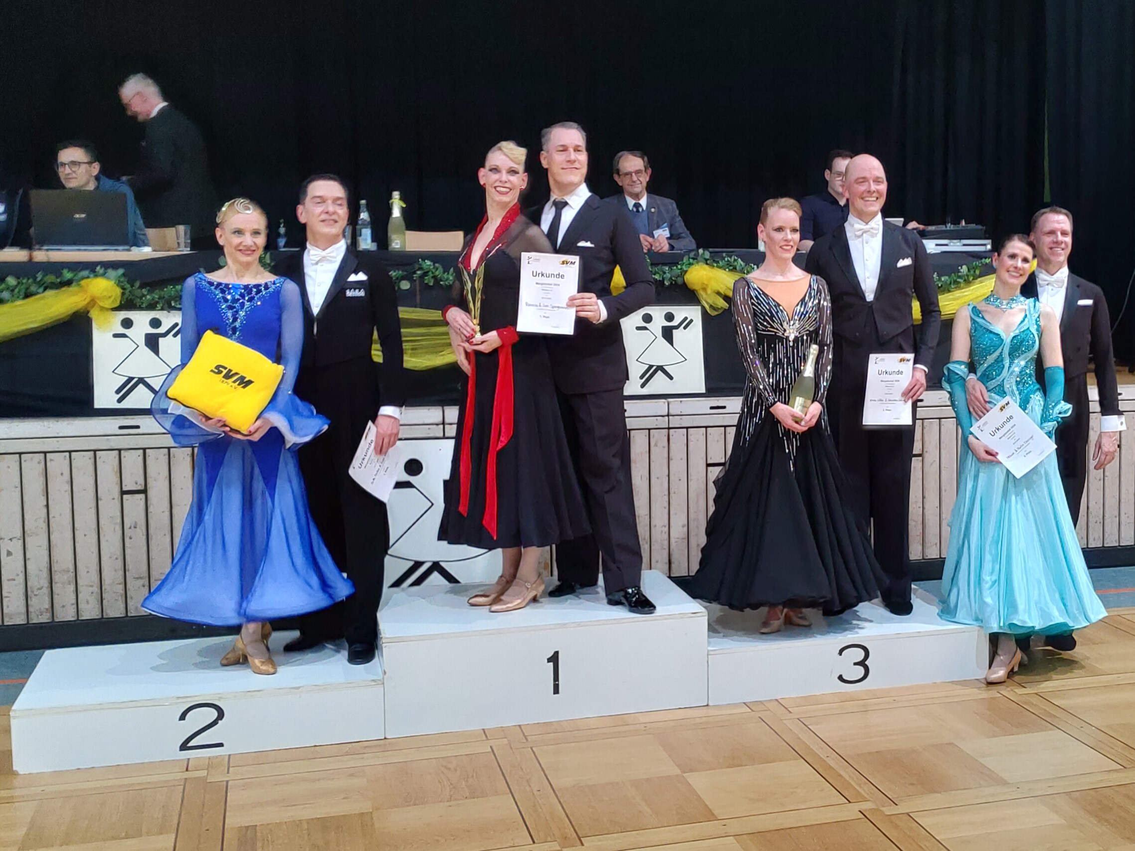 Pünktlich um 17 Uhr starteten dann die Paare der MAS II in ihre Sichtungsrunde. Im Finale wurde die erste offene Wertung mit Spannung erwartet und mit Freude entgegengenommen. Mit klaren Votum sah das Wertungsgericht Sven und Ramona auf dem ersten Platz – in allen fünf Tänzen. Somit durften sich die beiden am Ende des Turniers mit dem Pokal ganz oben auf das Podest stellen.