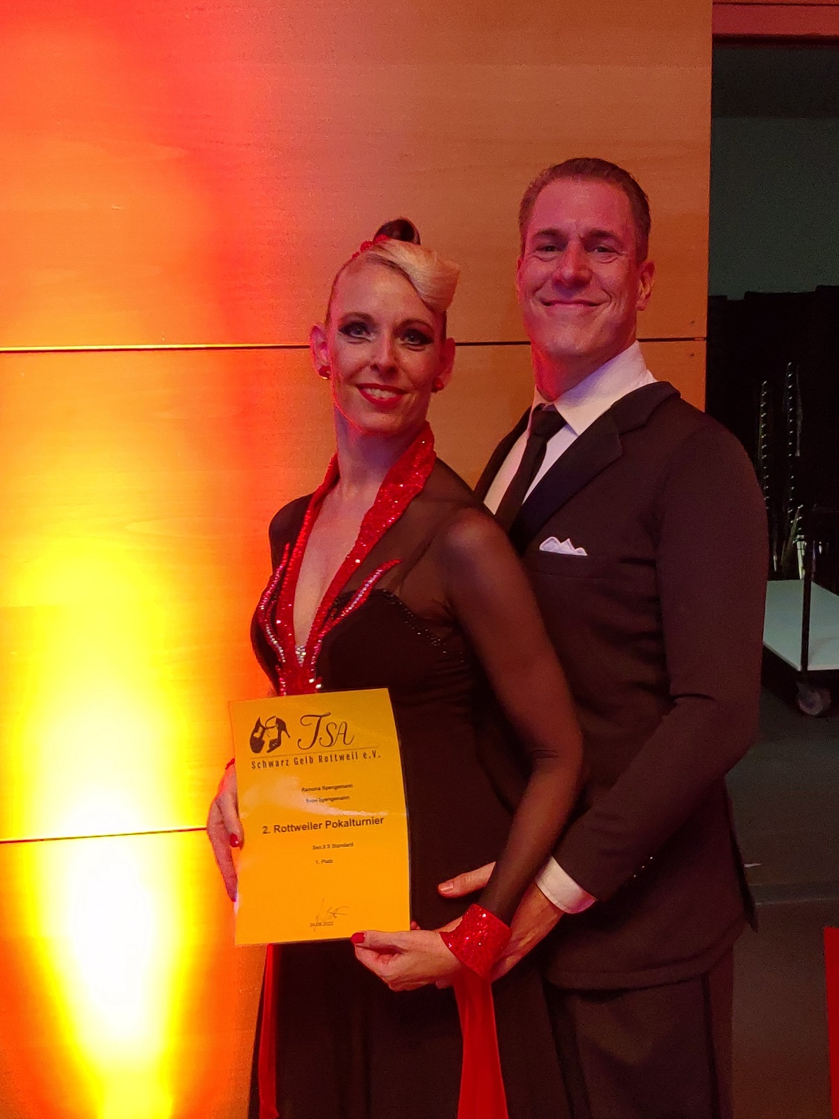 Zum 2. Mal nach 2019 hat die TSA Schwarz-Gelb Rottweil einen Gala-Ball mit Turnier ausgerichtet. Nach dem Latein-Turnier am frühen Abend war es dann gegen 22 Uhr Zeit für die acht Standardpaare der Senioren II. Die Vorrunde wurde in zwei Runden getanzt und das tanzbegeisterte Publikum unterstützte die Paare mit viel Applaus. Sven und Ramona Spengemann konnten an dem Tag mit der gezeigten Leistung nicht nur das Publikum sondern auch das Wertungsgericht überzeugen und so zogen die beiden souverän ins Finale ein. Das erwartete Kopf-an-Kopf-Rennen mit dem Zweitplatzierten blieb aus und die beiden konnten alle Tänze für sich entscheiden und sich am späten Abend über den Turniersieg freuen. Über einen neuen Pokal konnten sich die beiden allerdings nicht freuen – die gewünschten Pokale konnten nicht geliefert werden und so gab es zum Trost einen Trainingskostenzuschuss.