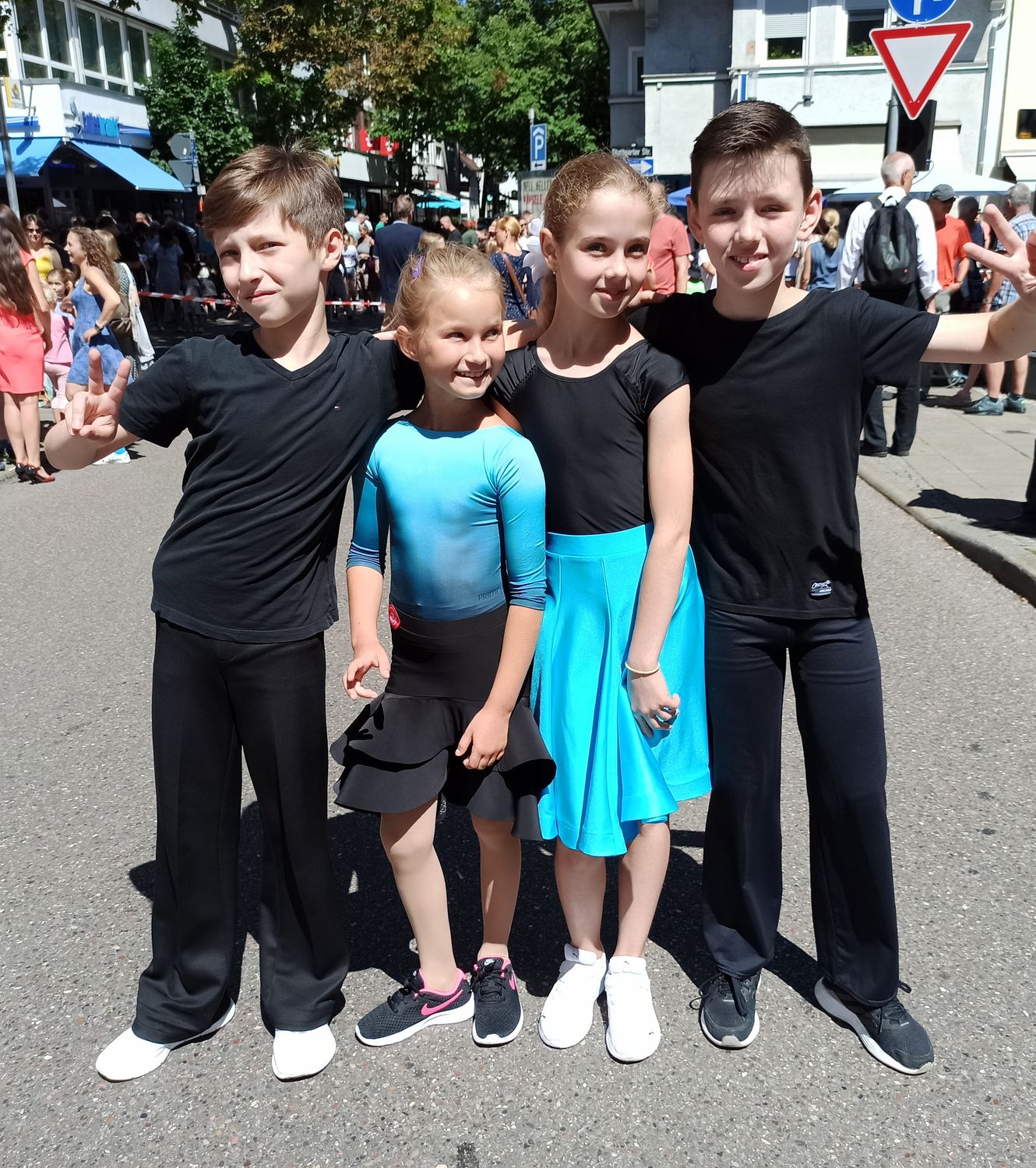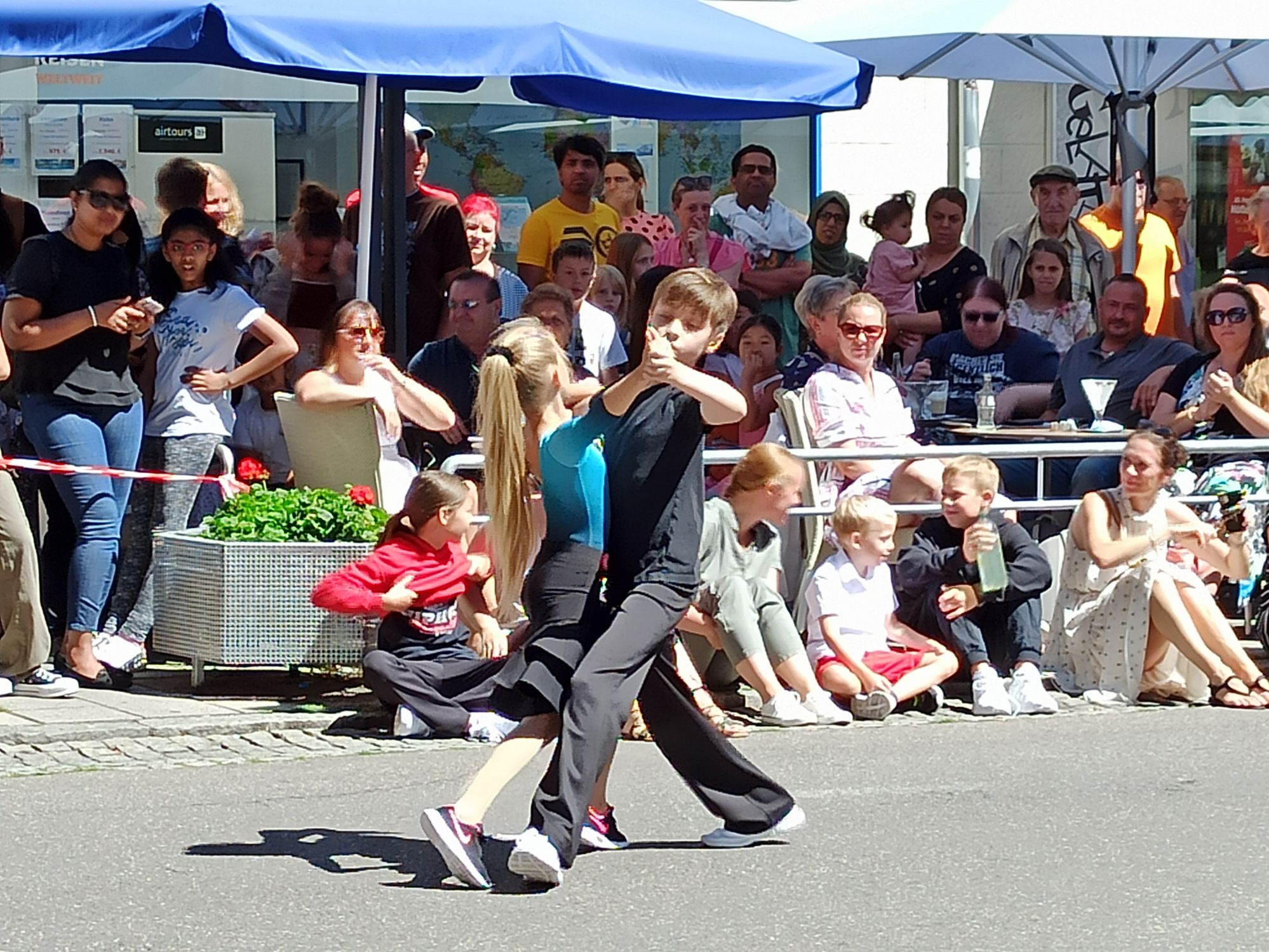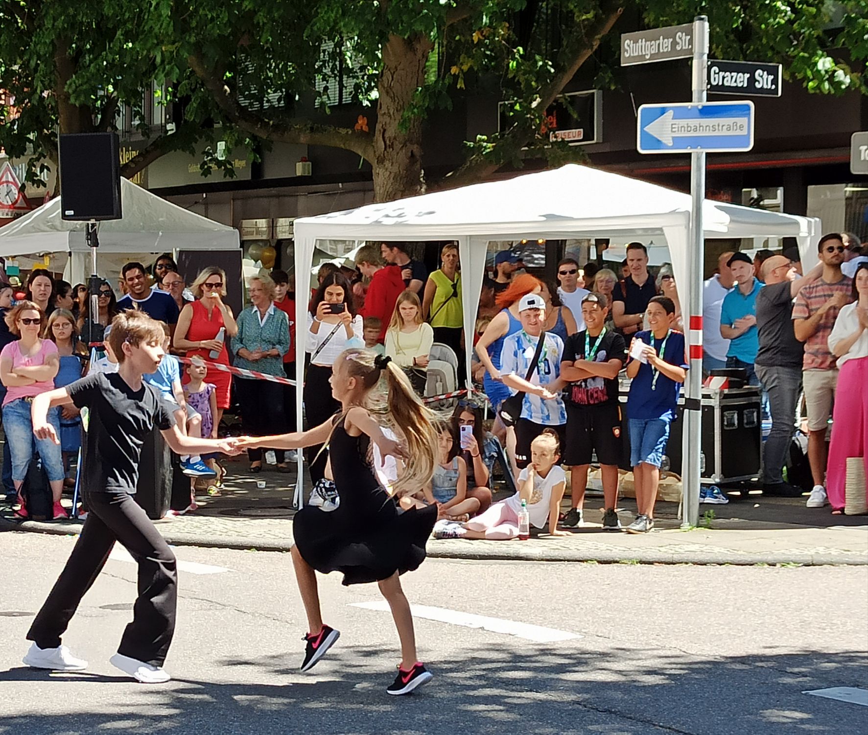 Auf der Kreuzung Stuttgarter Straße Ecke Grazer Straße zeigte unser Tanzsportnachwuchs, dass man nicht nur auf dem Parkett tanzen kann. Tim Gordon und Julia Feitelson sowie Robert und Isabelle Gurevich präsentierten abwechselnd einen Standard- und einen Lateintanz. Mit der Darbietung begeisterten sie das Publikum, welches ausgiebig applaudierte.