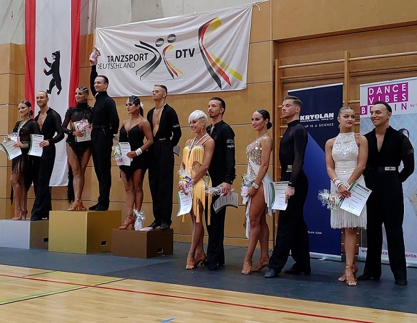 Auch am Samstag waren 2 unserer Paare in Berlin am Start. Zur Mittagszeit fand das Turnier der Hauptgruppe S Latein statt und hier waren Michael Ziga und Pénélope Zschäbitz unter den 20 Teilnehmern. Die beiden tanzten sich im Finale mit 2 x Platz 5 und 3 x Platz 6 auf einen tollen 6. Platz.