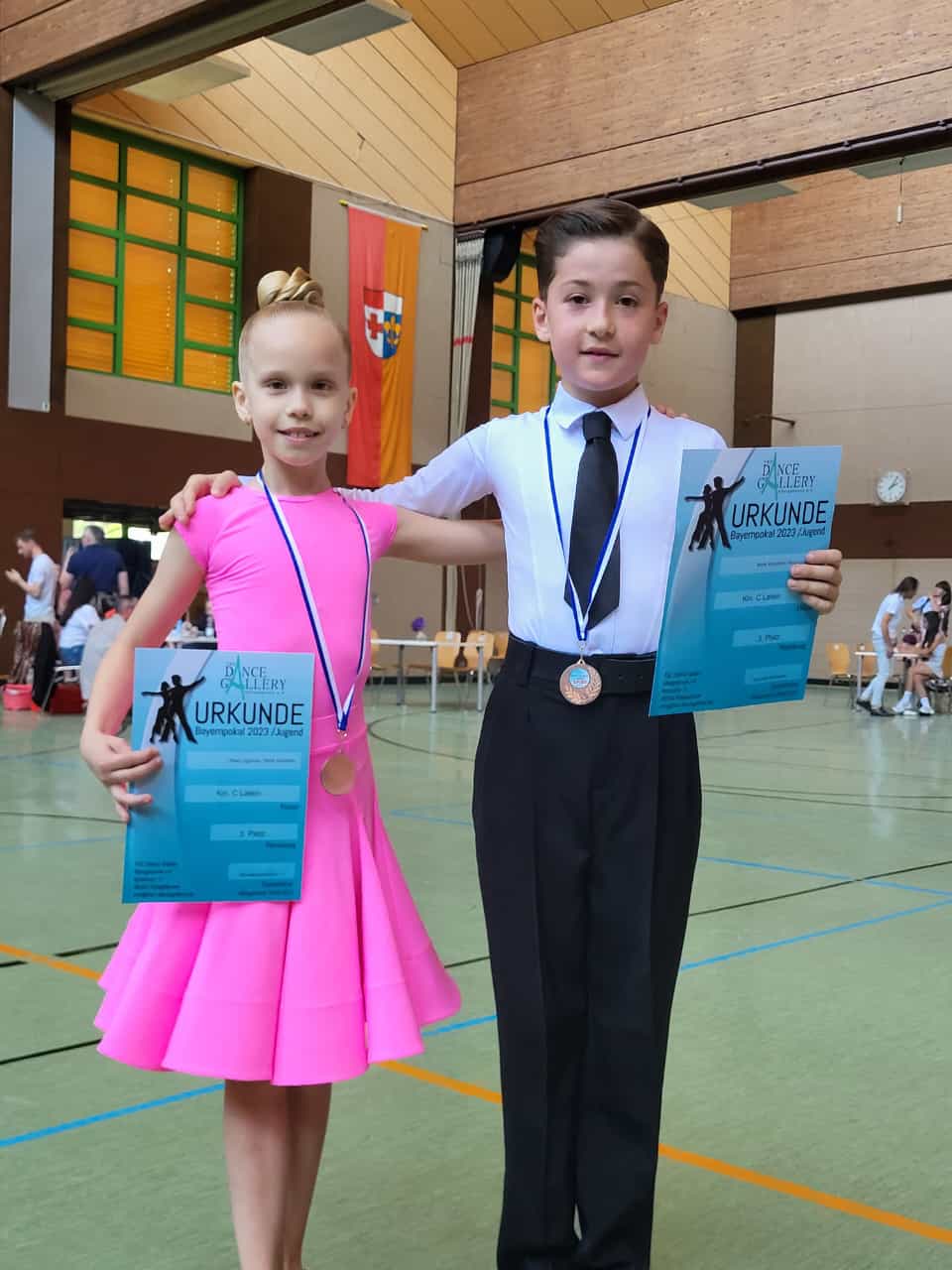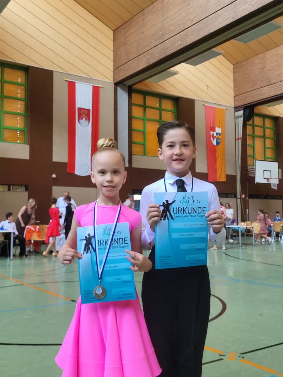 Zur Mittgaszeit waren die Turniere der Lateinsektion dran und die beiden tanzten zuerst in der Kinder C und anschließend in der Junioren I C Latein – in beiden Fällen mit Erfolg. Mit der gezeigten Leistung tanzten Mark und Alisa nicht nur ins Finale sondern in beiden Turnieren auch auf das Treppchen. In der Kinder C tanzten die beiden vor auf den 3. Platz und in der Junioren I C sogar auf den 2. Platz. Damit sicherten sie sich gleich zwei Aufstiegsplatzierungen.