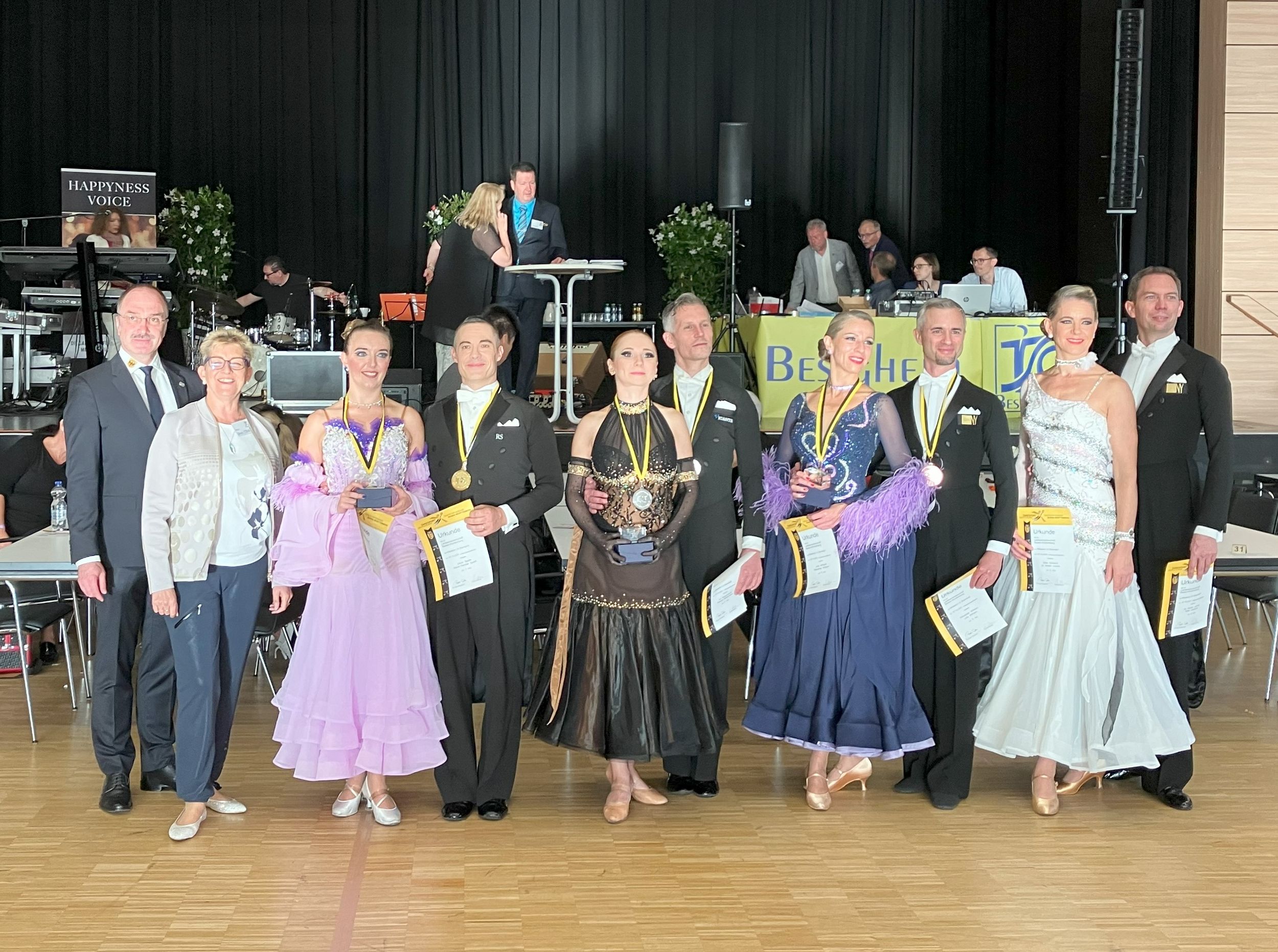 Die Turniere der MAS I S sowie der Hauptgruppe wurden dann am Abend im Rahmen des Balles der Abendveranstaltung ausgetragen und tanzten zur Live-Musik. Nach dem Aufstieg von Oliver und Marie tanzten in der MAS I S nun zwei TSZ-Paare. Oliver und Marie belegten mit der gezeigten Leistung den 4. Platz und konnten sich hierbei auch ein paar 3er-Wertungen sichern. Markus und Silke Vogel starteten unter dem Motto „vom Krankenbett auf das Parkett“ und konnten sich neben der Silbermedaille auch ein paar Bestnoten sichern.