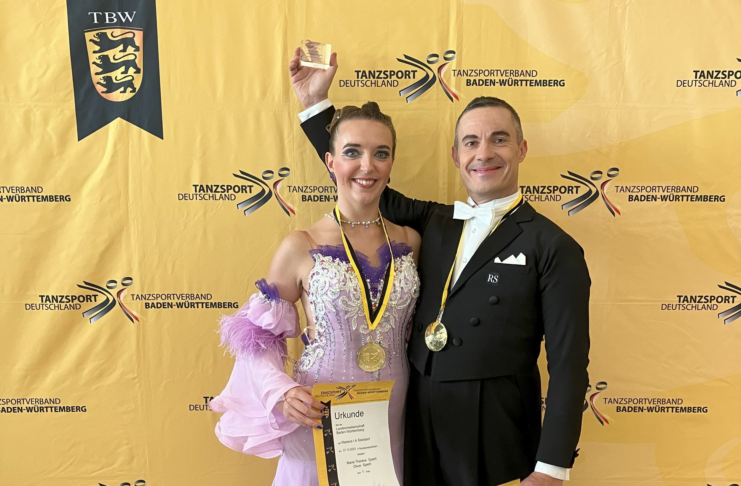 Als nächstes gingen Oliver und Marie-Therése Spieth in der MAS I A an den Start. Mit einem 2. Platz im Langsamen Walzer und dem 1. Platz in allen anderen Tänzen sicherten sich die beiden nicht nur den Landesmeistertitel sondern auch den Aufstieg in die S-Klasse!
