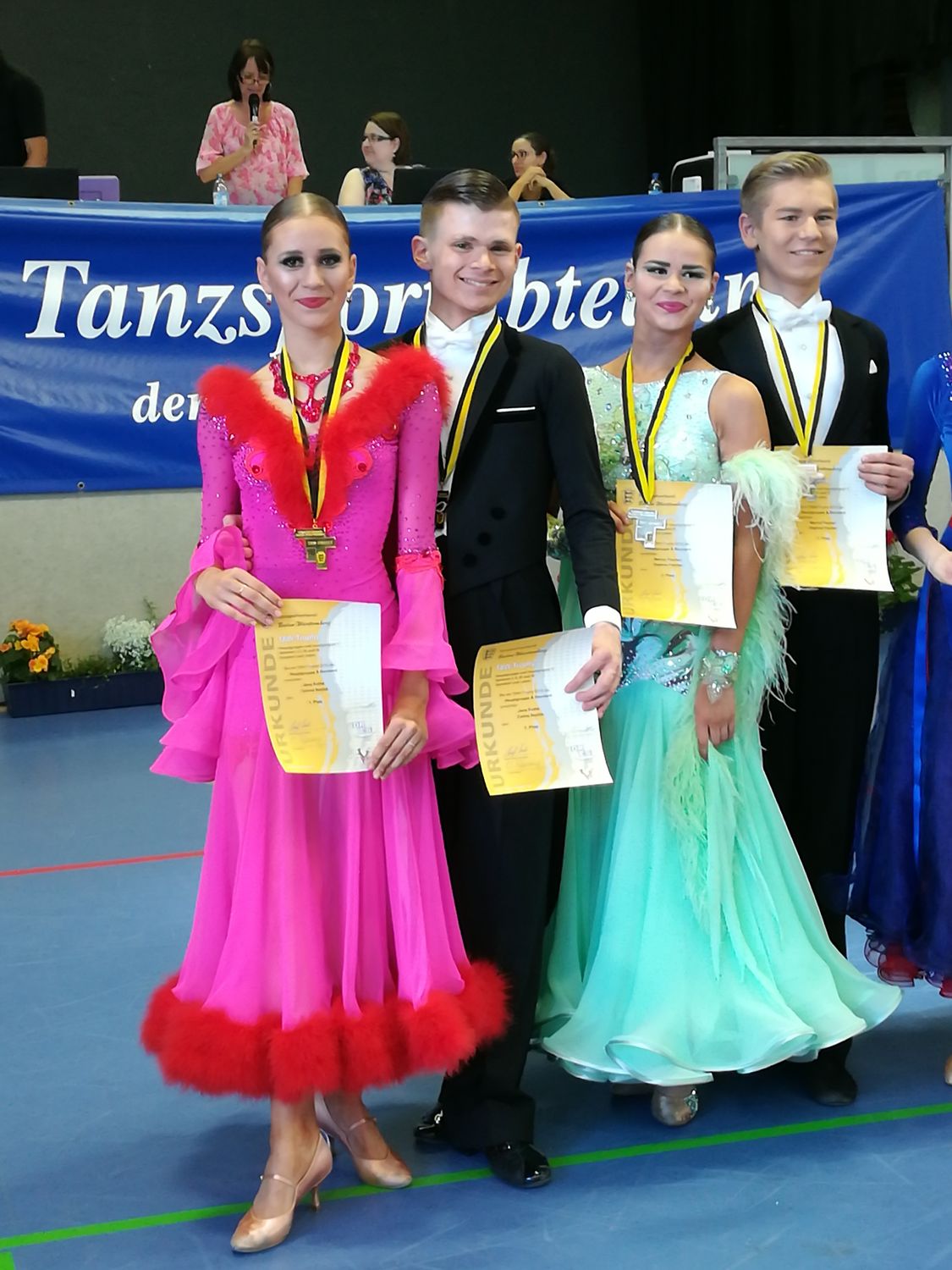 Am 30.6. und 1.7. fanden die letzten Qualifikationsturniere in Weinheim statt. Die Anreise war etwas beschwerlich, da ein Teilabschnitt der A5 für das gesamte Wochenende gesperrt war. Aber letztendlich kamen Jens, Celine und Familie rechtzeitig an, so dass genügend Zeit blieb zum Eintanzen. Trotz Temperaturen um die 30 Grad Celsius brachten alle Paare Höchstleistungen. Jens Kothe und Celine Sejdijaj starteten in der HGR A-Standard und konnten sich klar für die Endrunde qualifizieren und belegten den 3. Platz. Herzlichen Glückwunsch!