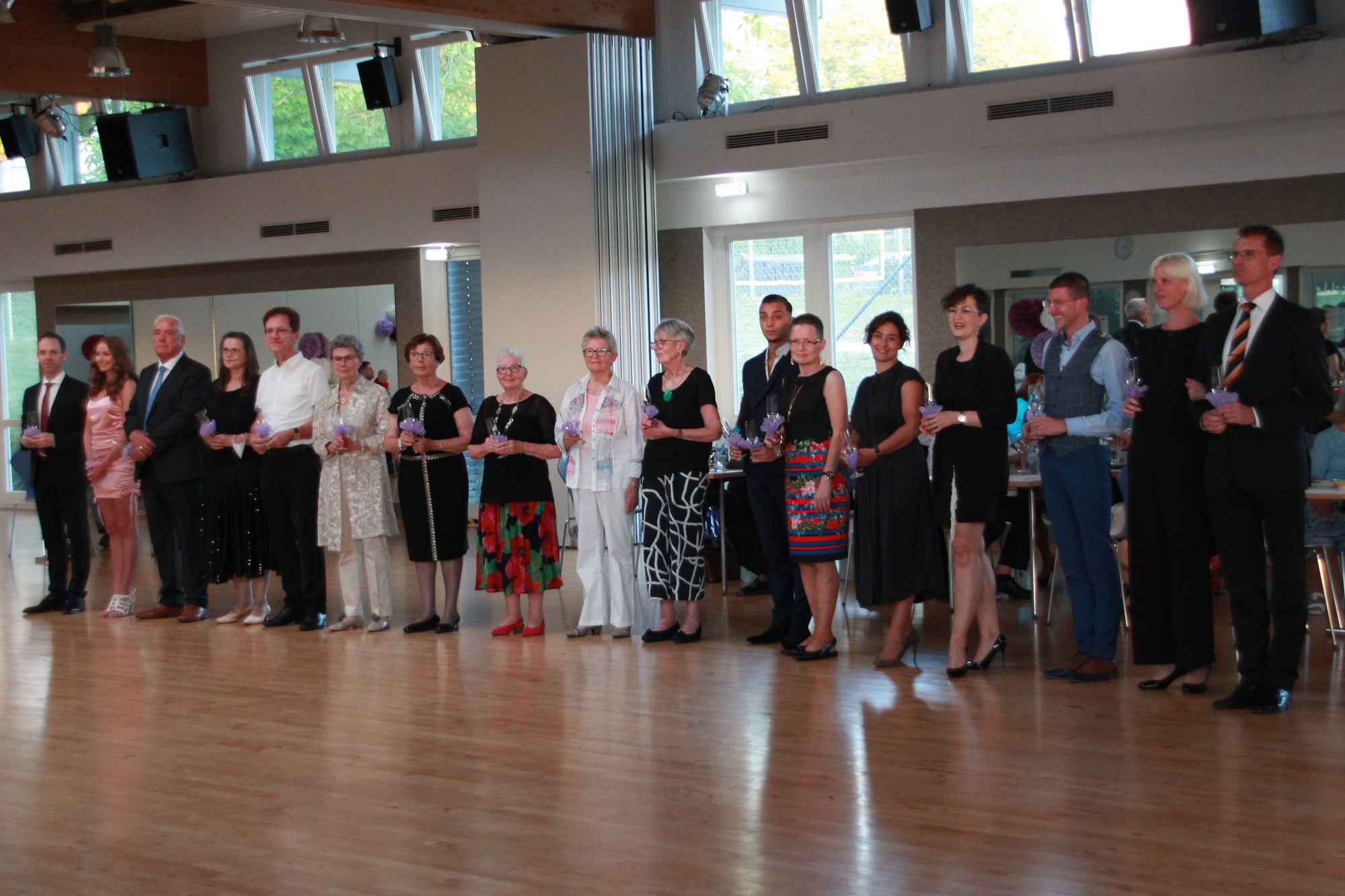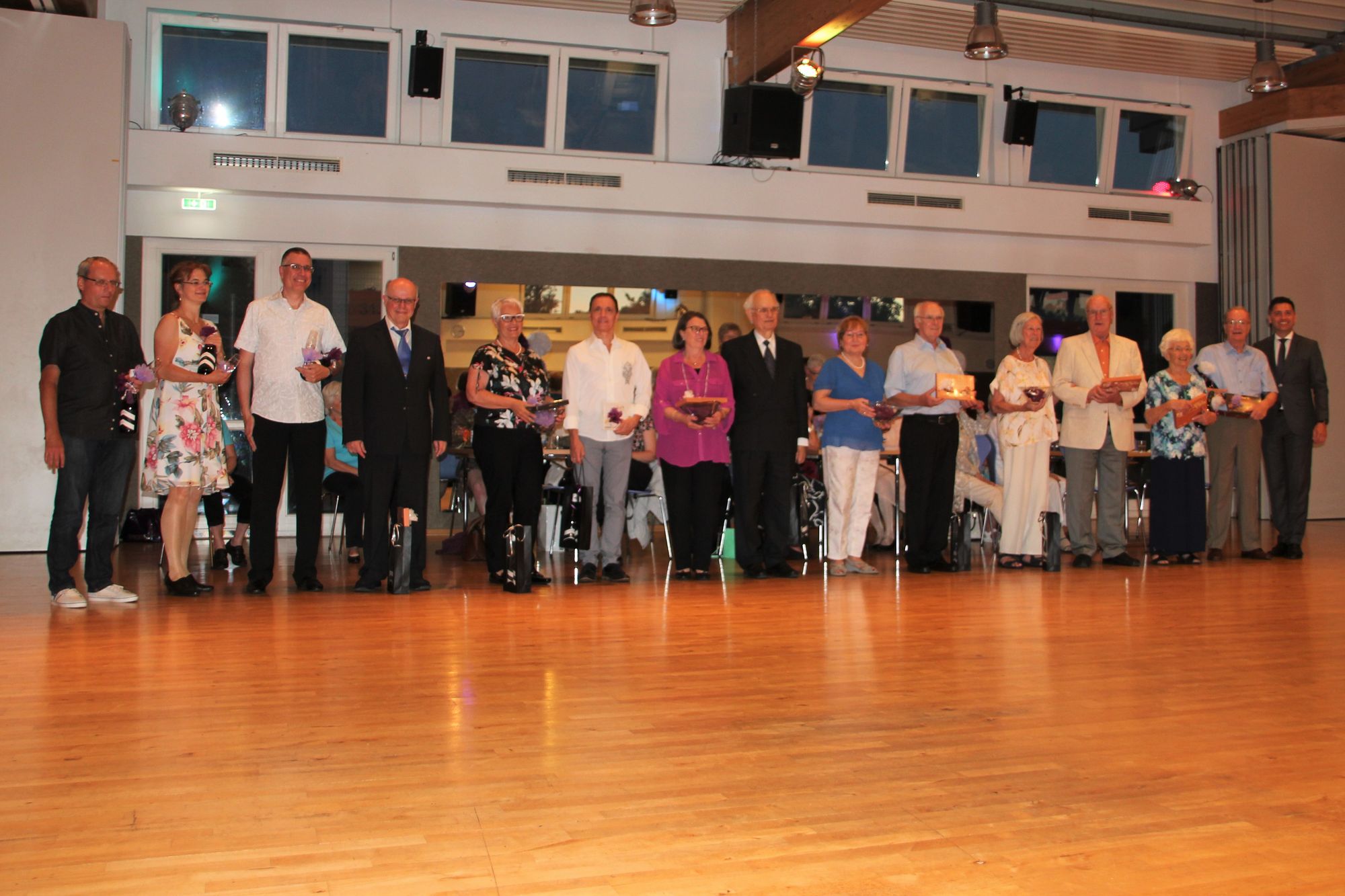 Am späten Nachmittag wurde die Veranstaltung mit dem traditionellen Sektempfang eröffent und am frühen Abend begann dann der offzielle Teil mit den Shows sowie den Ehrungen von Sportlern und Jubilaren. Da die Jubilare von 3 Jahrgängen geehrt wurden, gab es hier Ehrungen in zwei Gruppen: zuerst die Personen mit 10 bzw. 20 Jahren Vereinszugehörigkeit, später am Abend dann die Jubilare mit 25 bis 60 (!) Jahren Vereinsmitgliedschaft. Ingeborg Schlegel und Peter Bickendorf sind unsere beiden Mitglieder, die mit dem 60-jährigen Jubiläum quasi Mitglieder der ersten Stunde sind.