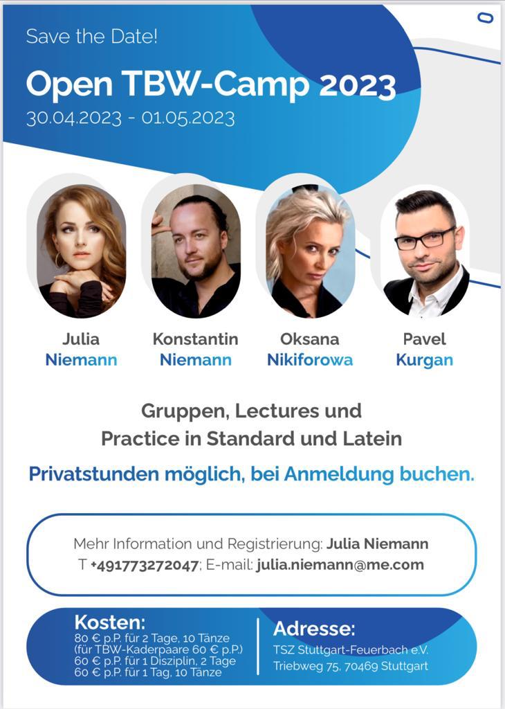 es ist soweit: am 30.4. (Sonntag) und 1.5. (Feiertag) findet das große TSZ-Camp Standard + Latein im TSZ statt! Alle Paare sind herzlich willkommen, auch Paare anderer Vereine. Für alle TBW-Kaderpaare und die TSZ-Jugend gibt es Sonderkonditionen.