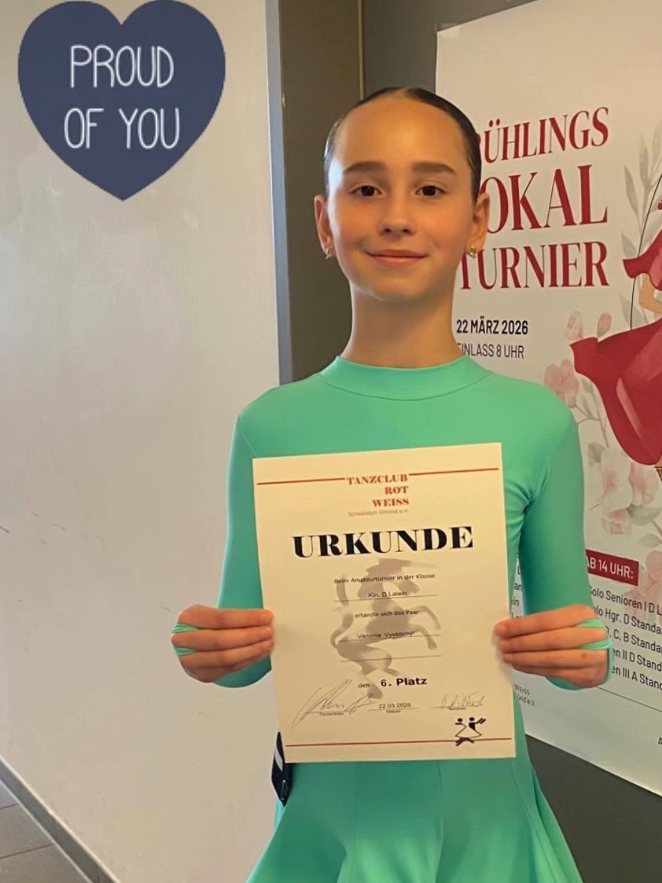 Ebenfalls erfolgreich am Start war Viktoriia Vyskochyl. Sie startete beim Solo Kin I/II D Latein und tanzte setzte sich über Vorrunde und Zwischenrunde gegen die Konkurrenz durch. Im Finale fehlte ein kleines Quäntchen Glück, denn bei den gemischten Wertungen ergab sich für zwei Starter die gleiche Platzziffer. Im Skating ergab sich dann ein toller 6. Platz für Viktoria.