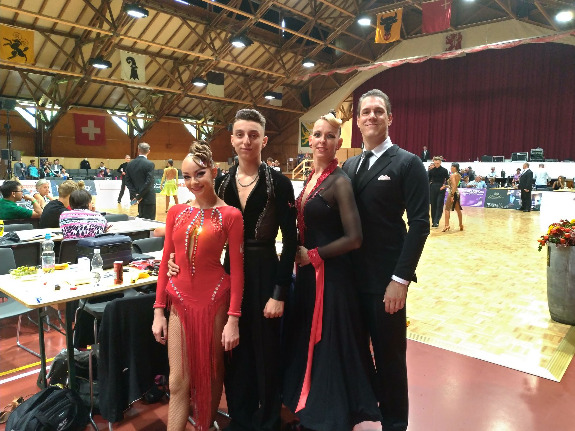 Der vergangene Samstag stand im kleinen Ort Frauenfeld ganz im Zeichen des Tanzsports, denn den ganzen Tag fanden in der Festhalle Rüegerholz WDSF-Turniere beider Sektionen für verschiedene Altersstufen statt. Morgens um 10 h starteten Sven und Ramona Spengemann mit 33 weiteren Paaren ins Turnier der Senioren II S-Standard. Trotz der frühen Stunde wussten die beiden das Wertungsgericht zu überzeugen und zogen ohne Probleme am Re-Dance vorbei in das Viertelfinale ein. Dies bedeutete eine kleine Pause, die aber dank des schönen Wetters problemlos in der Sonne genossen werden konnte. Während die beiden also die frische Luft genossen, starteten Marco Ziga und Melody Badt in ihr erstes Turnier des Tages, das WDSF Junior II Latein-Turnier. Mit fast makelloser Kreuzbilanz qualifizierten sie sich für das Semifinale. Nun war es an Marco und Melody, sich ein wenig zu entspannen und Ramona und Sven tanzten ihr Viertelfinale. Mit der dargebotenen Leistung erreichten Sven und Ramona nicht nur das Publikum, sondern sie überzeugten erneut die Wertungsrichter und zogen ins Semifinale ein, das in zwei Runden getanzt wurde. Somit konnten sich die Paare auf der Fläche voll entfalten! Mit weichem und musikalischem Tanzen sicherten sich Sven und Ramona in der Endabrechnung einen tollen 9. Platz. Im Anschluss an das Semifinale der Senioren fand das Semifinale der Junioren II Latein statt. Marco und Melody tanzten sehr ausdrucksstark und sicherten sich dominant den Einzug ins Finale, das in der Abendveranstaltung ausgetragen wurde.