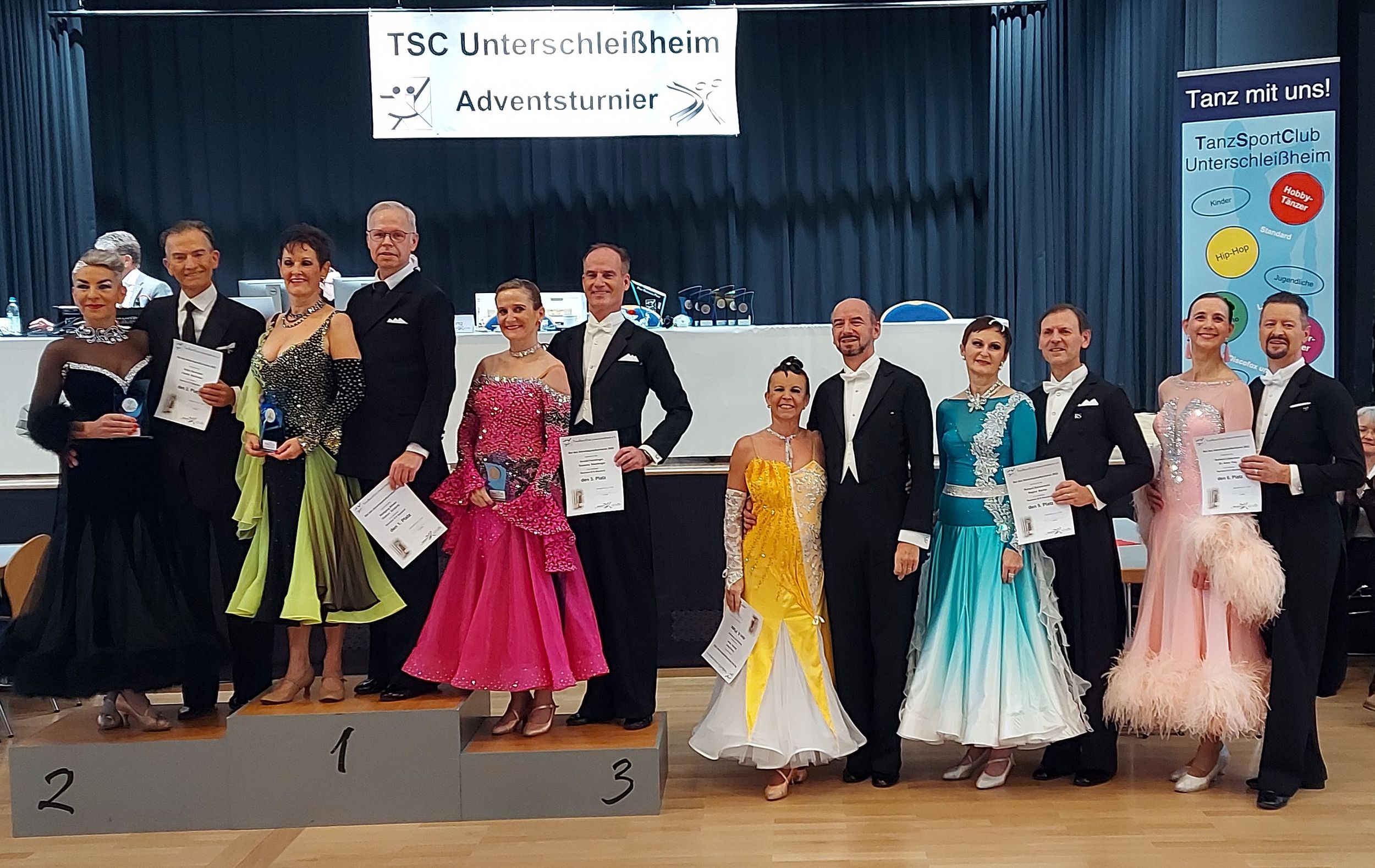 Zum Adventsturnier nach Unterschleißheim zog es Wolfgang Binder und Gudrun Schürrle. Die beiden starteten im Turnier der Senioren III S Standard und konnten sich bereits in der Vorrunde gut präsentieren. Das sechspaarige Finale wurde mit einer geschlossenen Wertung durchgeführt und so war bis zum Ende spannend, welches der Paare am Ende die Nase vorne haben würde. Der nachträgliche Blick auf die Wertungen offenbarte, dass das Wertungsgericht sehr unterschiedliche Schwerpunkte setzte und so verteilten sich die Bestnoten auf vier Paare. Die Auswertung aller Wertungen ergab einen Sieg für Wolfgang und Gudrun!