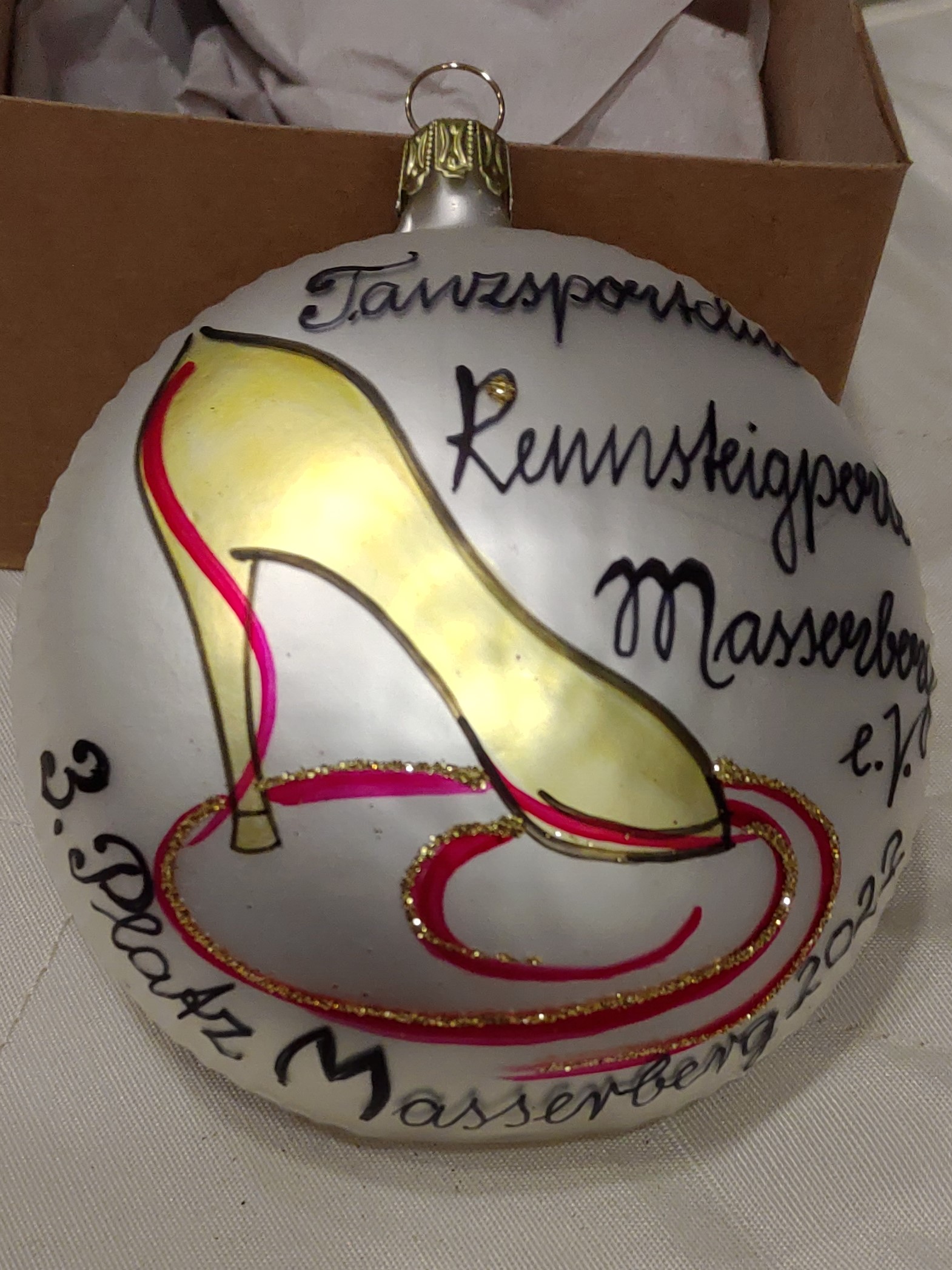Am Samstag fanden im thüringischen Masserberg die Weihnachtsbaum-Turniere statt und am Abend tanzten die Paare der Senioren II S Standard im Rahmen des Balls. Hier wurde das TSZ von Sven und Ramona Spengemann vertreten. Nach dem Einmarsch gab es eine eigens für diese Veranstaltung angefertigte Christbaumkugel in Form eines Tanzschuhs.