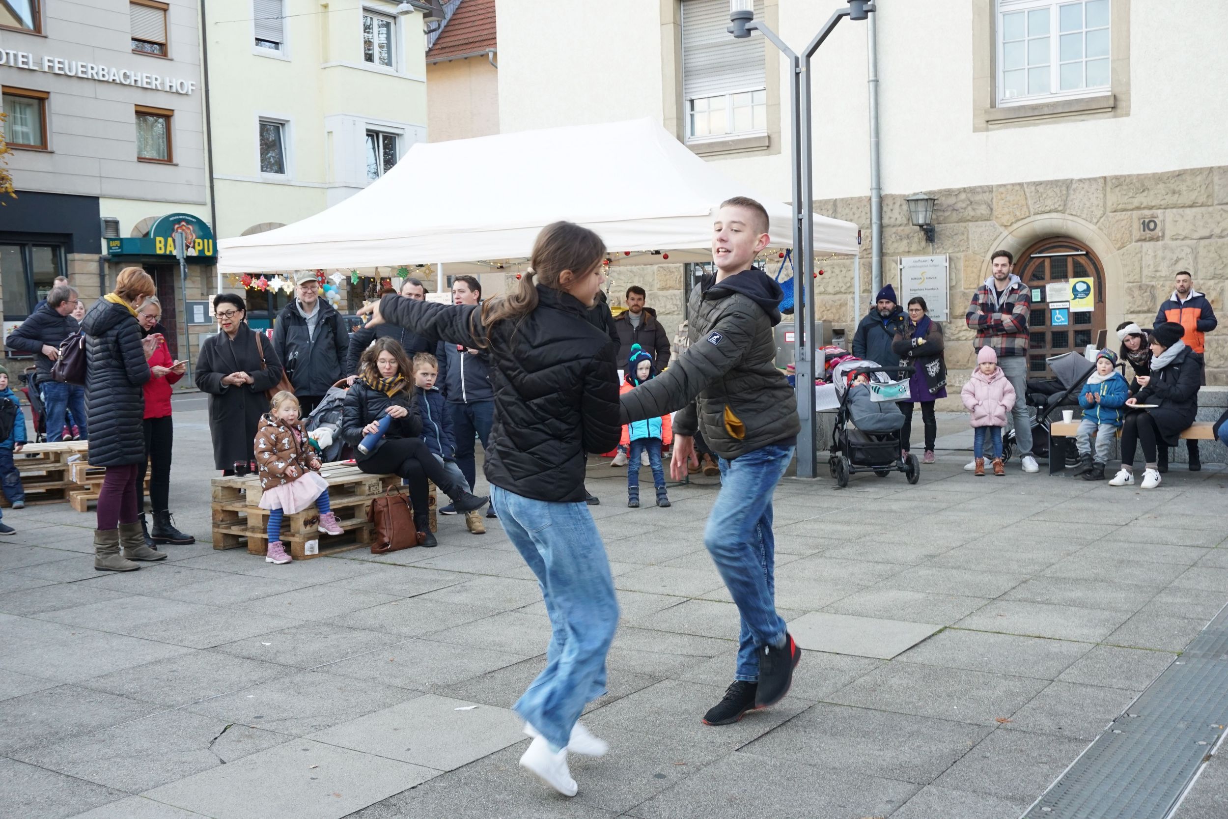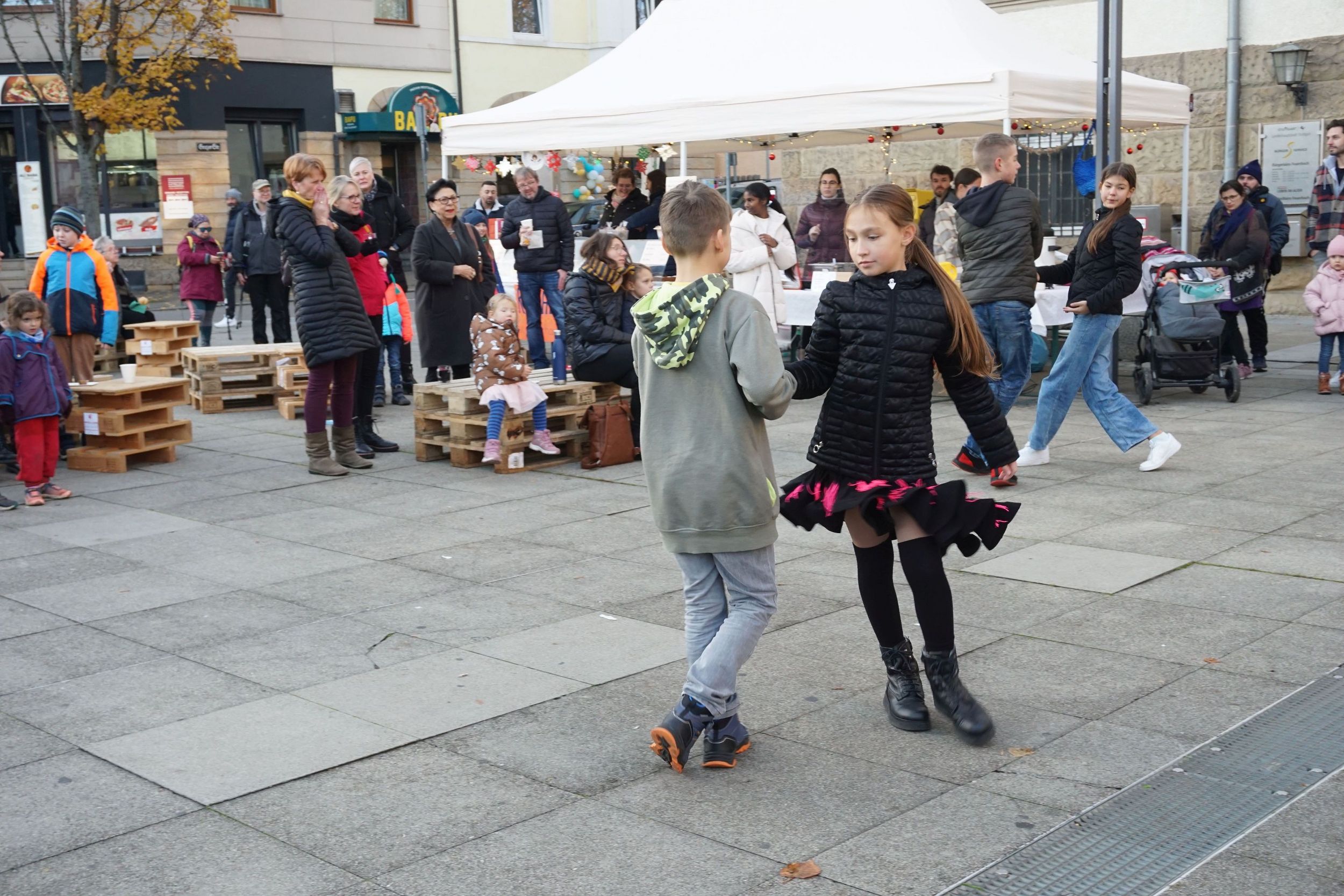 Es tanzten unter der Leitung von Elina Geller zwei Tanzpaare zum Beginn des Programms auf dem Wilhelm Geiger Platz. Der Weihnachtsbaum wurde erleuchtet durch den Bezirksvorsteher Johannes Heberle.